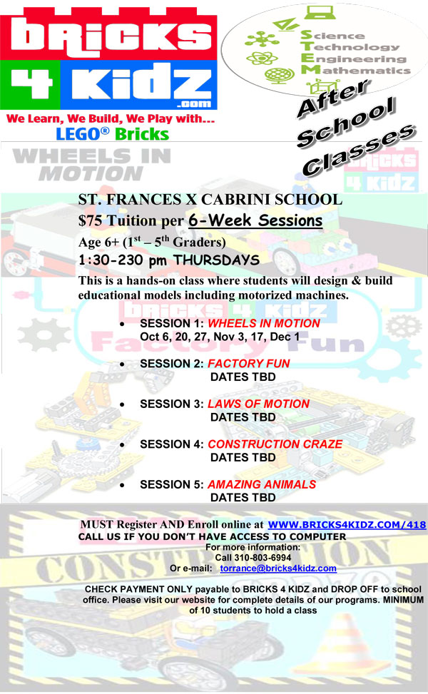 We are offering an exciting new after school program called Bricks 4 Kidz. This is a hands-on class where students will design and build educational models including motorized machines. Please take a look!