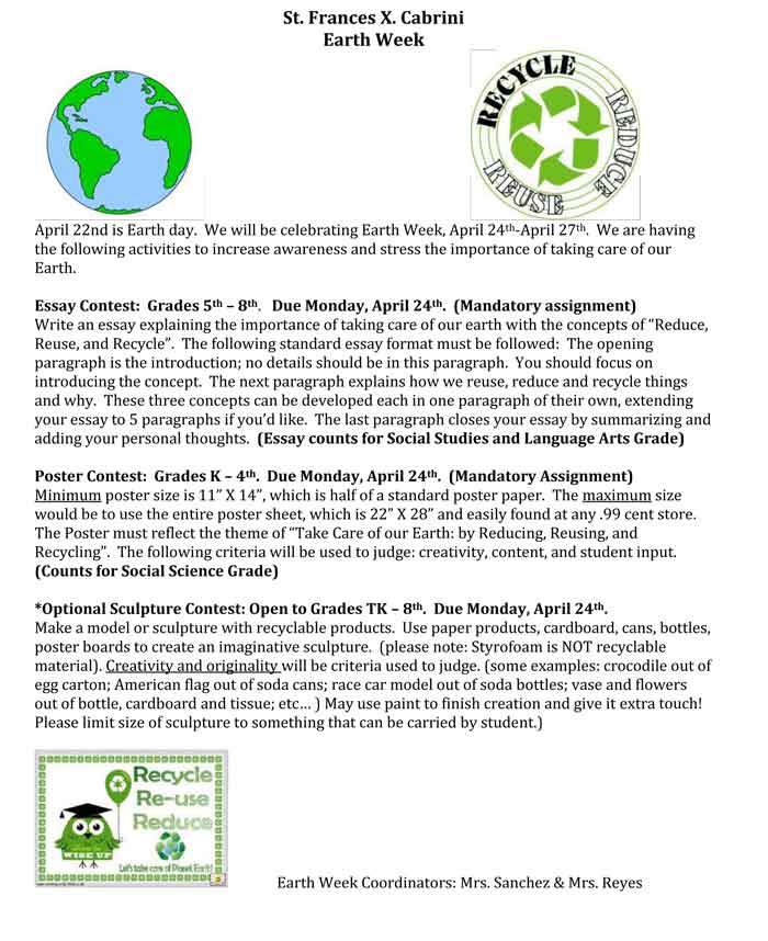 We will be celebrating Earth Week, April 24 – 27, with many activities to increase awareness and stress the importance of taking care of our Earth.